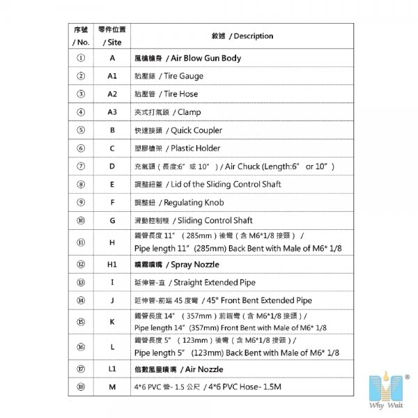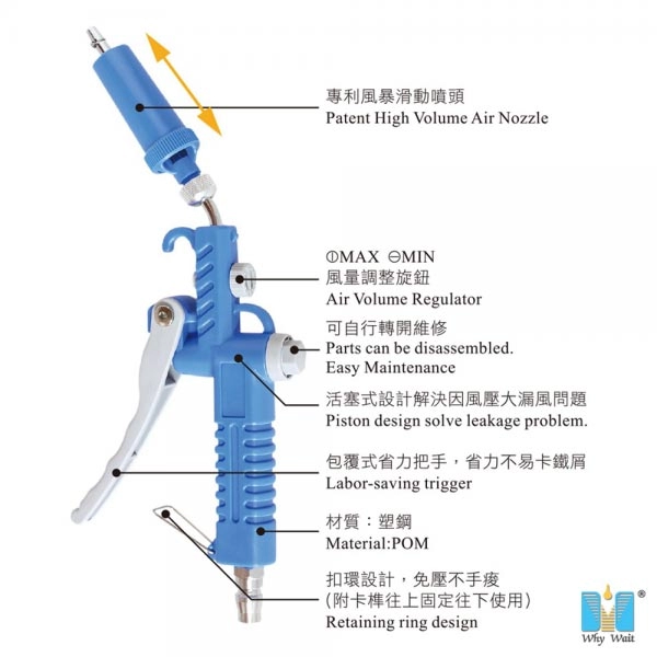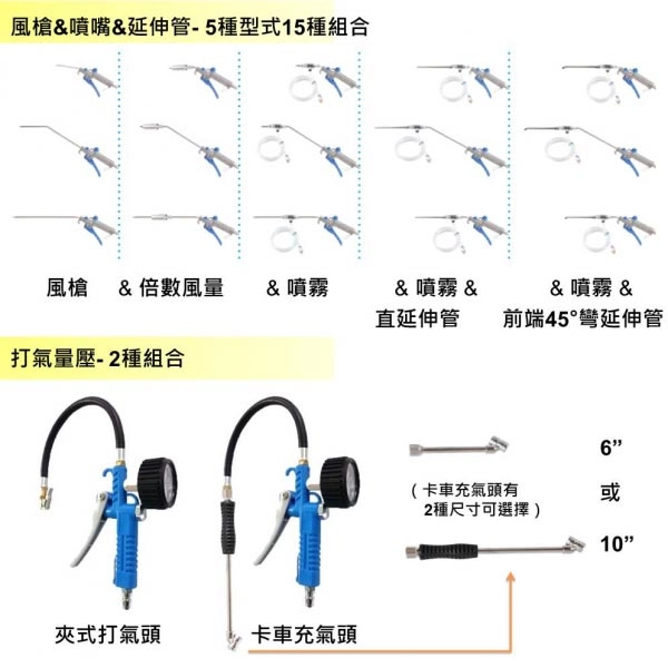 【風槍】+【滑動倍數風量噴嘴】+【滑動噴霧噴嘴】+【延伸管】15種組合 (此操作之示範圖示為鋁製材質,實際材質為塑鋼POM)